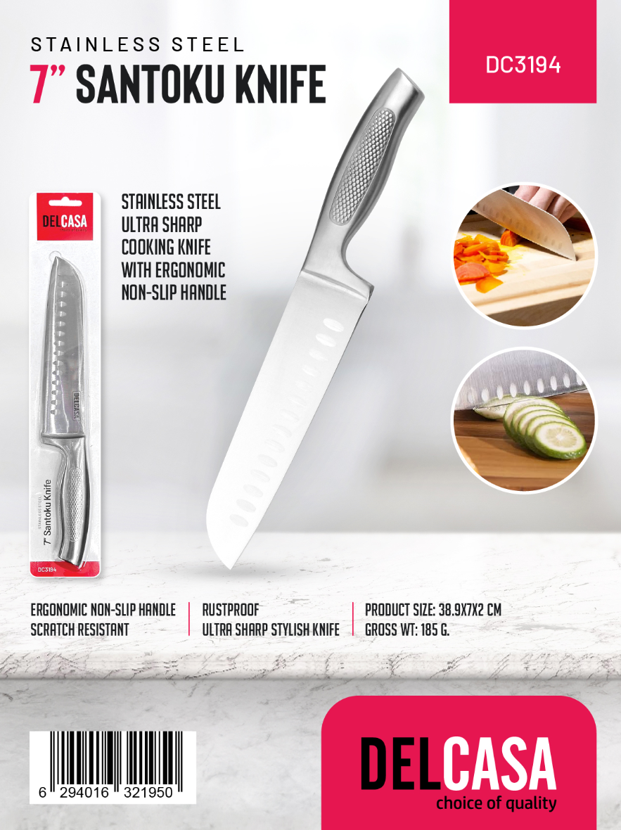 سكين سانتوكو - بشفرات من الفولاذ المقاوم للصدأ حادة للغاية ومقبض مقاوم للصدأ / 100% آمن على الطعام، مناسب لطاولة الطعام والمنزل والمطعم / مثالي للتقطيع والتقطيع إلى مكعبات وفرم وتقطيع شرائح رقيقة من الخضار واللحوم / فضي