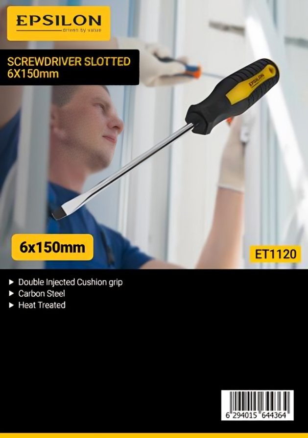 مفك براغي مشقوق - 6 × 150 مم، بمقبض مبطن مزدوج الحقن، مصنوع من فولاذ كربوني عالي الجودة ومعالج حرارياً | مثالي لفك وربط البراغي المشقوقة | أسود وأصفر