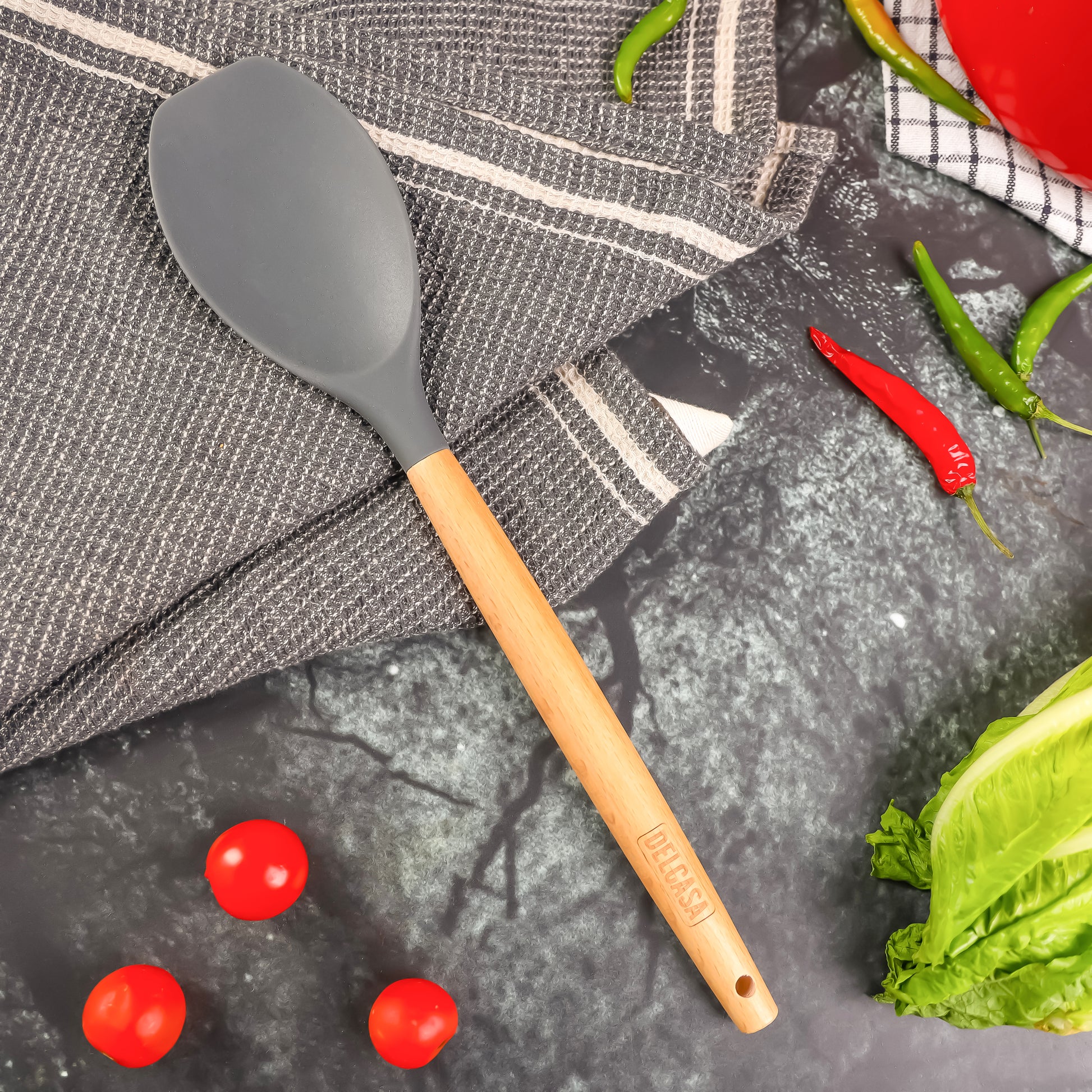 Silicone Rice Spoon- with Wooden Hand, Ideal for Serving, Mixing, Baking, Stirring and Cooking Curry, Sauces, Pasta, etc./ with a Comfortable Handle, Elegant and Lightweight Design, Food-Grade/ Black and Brown