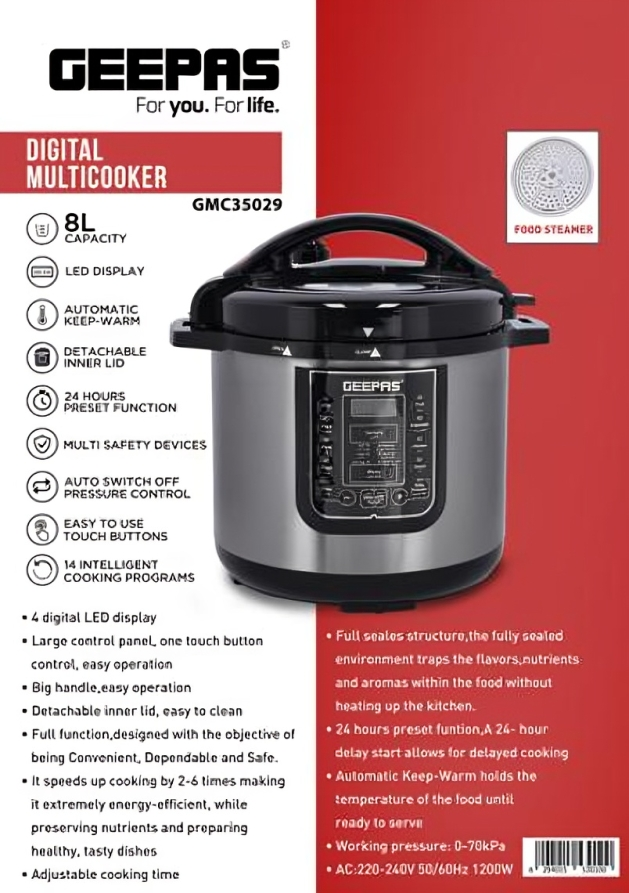 Çêkera Piralî ya Dîjîtal a 8L - Ekrana LED ya Veguhêzbar bi Menûya Destikê | 14 Bername, Fonksiyona Girtina Otomatîk | Kapasîteya 8L | Qapaxa Hundir a Veqetandî