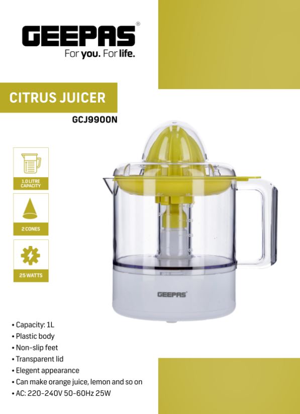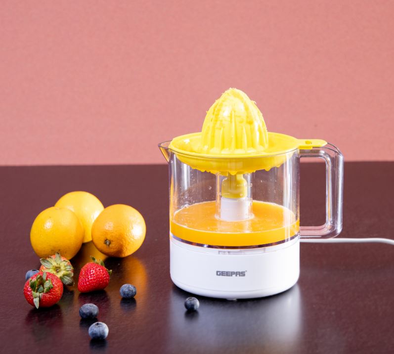 Ava fêkiyan a sîtrusê ya 1 lîtreyî - Set 2 kon, qûz û qapaxek şefaf dihewîne | Ava fêkiyan a otomatîk ji bo çêkirina ava porteqalê, lîmonê û hwd. | Laşê plastîk bi lingên nelihevhatî | 25 W | Garantiya 2 salan