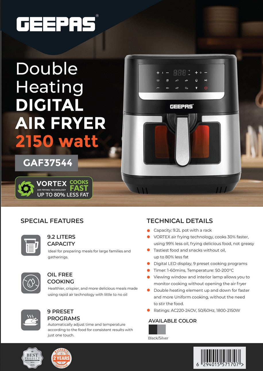 Sorkera Hewayî ya Dîjîtal a Germkirina Duqat - Tencereya 9.2 L bi Refikê, bi Teknolojiya Sorkirinê ya Vortex / Dîmendera Dîjîtal, Demjimêra 1-60 Deqeyan, Germahî 50-200 Pileya Celsius / 9 Bernameyên Pêşwext Mîhengkirî, Pace, Çiraya Hundir / ji bo Firingî, Steak, Mirîşk, Kek, Goşt, Nan, hwd. / Garantiya 2 Salan, Reş û Zîv
