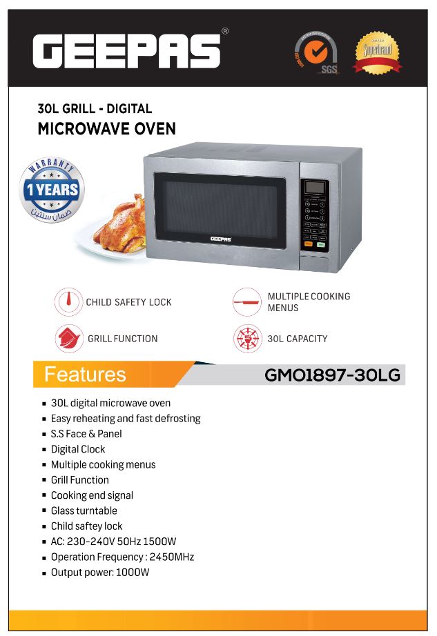Grîl - Firna Mîkropêlê ya Dîjîtal - Kapasîteya 30L - Firna 1500W bi Gelek Menûyên Pijandinê | Germkirin, Helandin û Grîlkirin | Grîlkirin, Sorkirin, Germkirin û Zêdetirên Îdeal