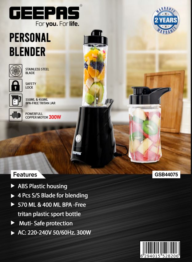 Blendera Şexsî | Tîjê Pola Zengarnegir - Qulfa Ewlehiyê, Kavanoza Tritan a 570ml û 400ml Bê BPA, Motora 300W, Parastina Pir-Ewle, Xanîya Plastîk a ABS