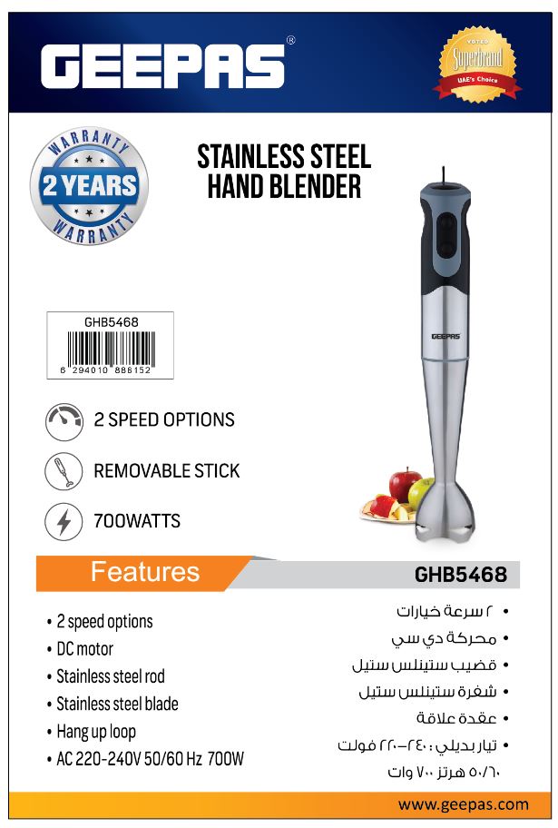 Mîksera Destan a Pola Zengarnegir - 800 W, Motora Bi Hêz bi Mîhengên 2 Leza / Mîkser bi Dar û Kêşên Pola Zengarnegir, Veqetandî / Ji bo çêkirina Smoothies, Milkshake, Sosan, hwd. / Zîv, 2 Sal Garantî