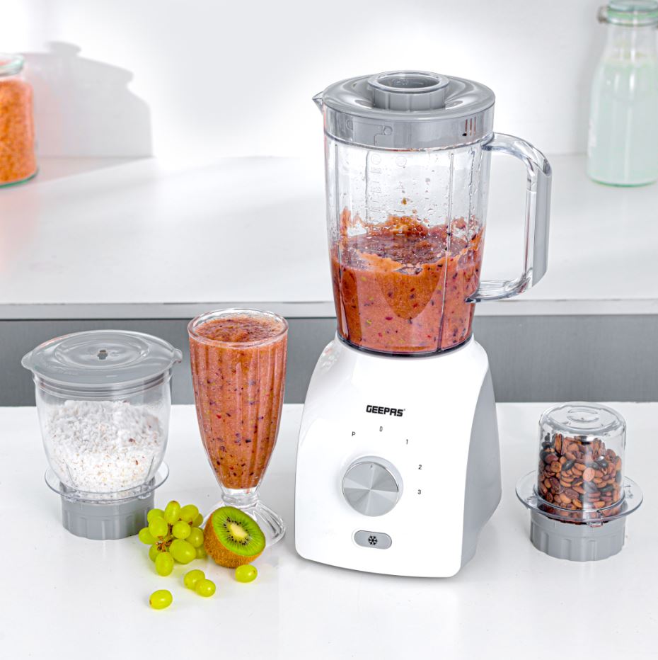 3-in-1 Blender- 600 W, Powerful Motor with 3 Speed Setting and Pulse/ Transparent Jars with Stainless Steel Blade, Grinder, Chopper Attachment/ For making Smoothies, Milkshakes, etc. Grinding Beans, Coconut, Nuts, etc. Ice Crushing/ White and Grey, 2 Years Warranty