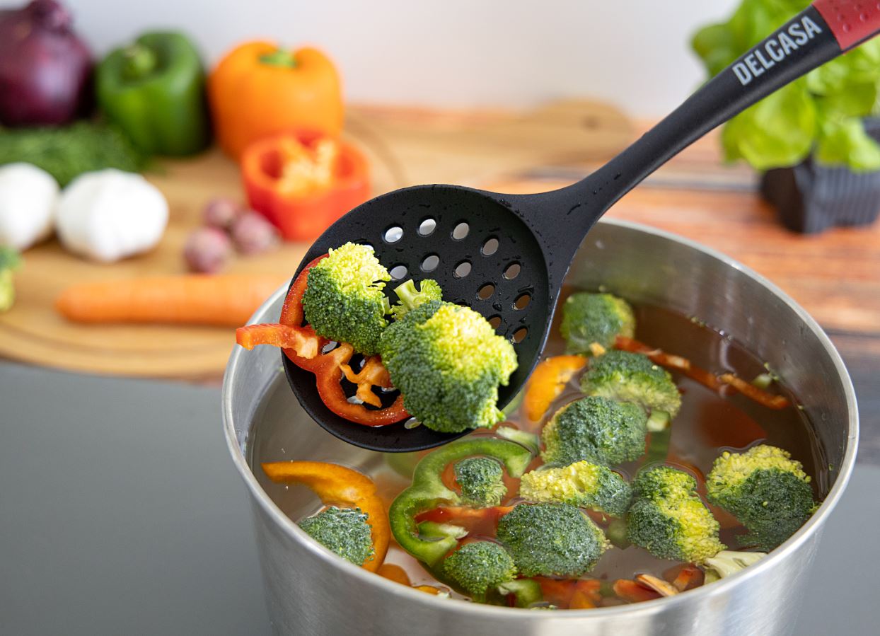 Nylon Skimmer - Slotted Spoon - Skimmer and Strainer Spoon - Ergonomic Heat Resistant Handle, Comfortable Grip Strainer Ladle for Kitchen - Non-Stick Design - Ideal for Straining & Skimming